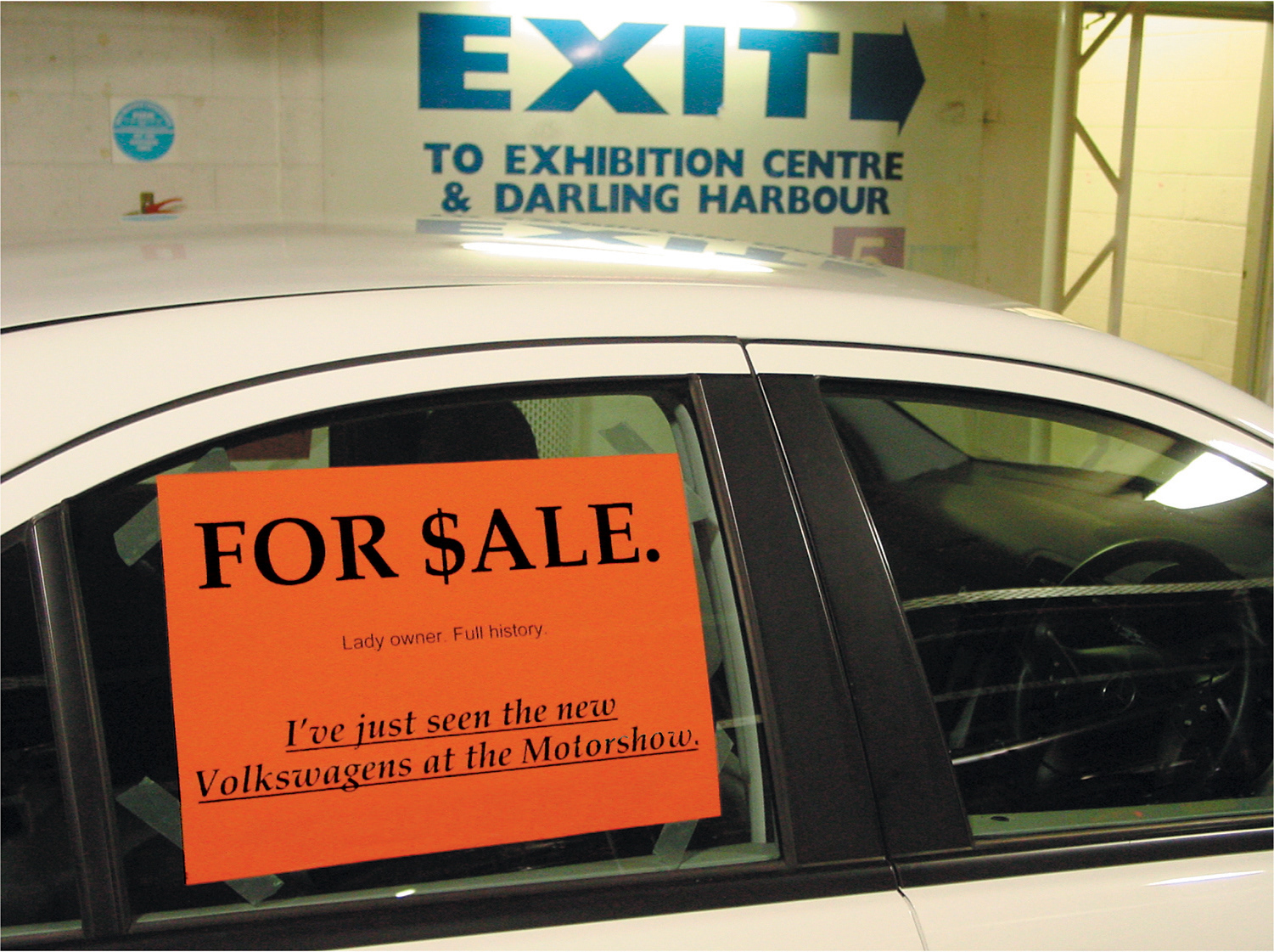 We hired a fleet of 20 prestige cars (BMW, Mercedes and Lexus) and positioned them near the main exits in the carpark to the 2001 Sydney Motorshow. On each car, we posted a variety of FOR SALE signs - the result of being able to see the new Passat for the very first time upstairs at the Motorshow.