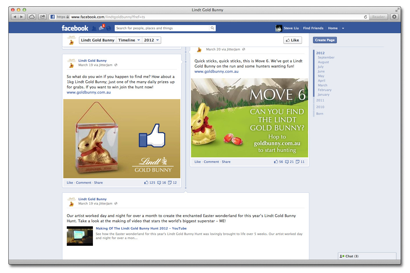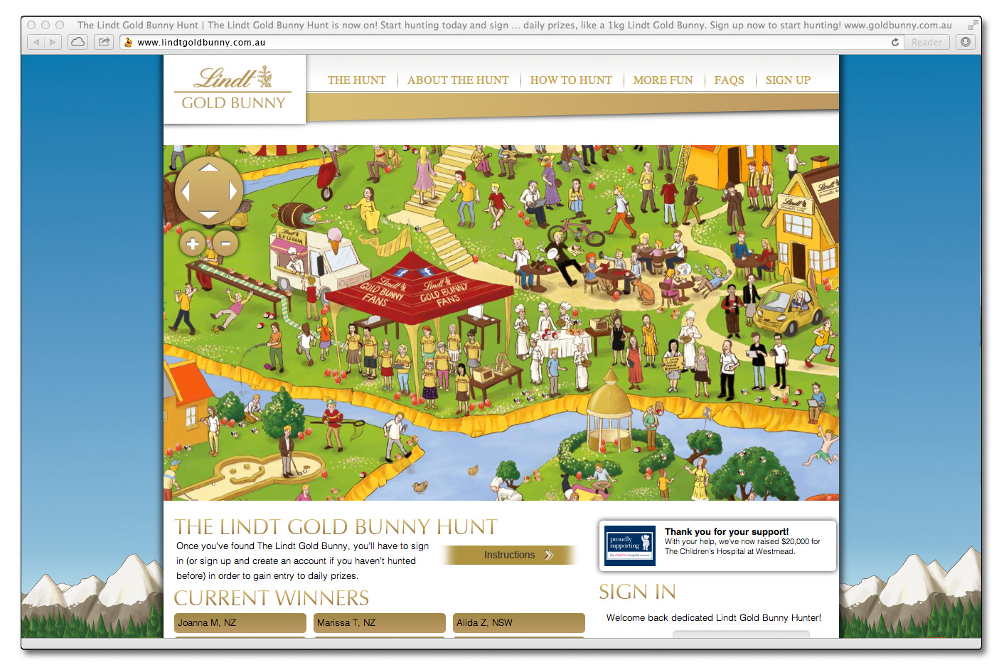 The Lindt Gold Bunny - the original Easter icon - was being threatened by cheaper, inferior imposters. We needed to rekindle people's love for him. In the lead up to Easter 2012, we hid the cheeky little Gold Bunny in an amazing Swiss Lindt wonderland and published it across the web, mobile sites, Facebook, in press ads and outdoor sites, encouraging the public to hunt for the frequently relocating Bunny. The four-week campaign resulted in 114,038 unique site visits, with an impressive average dwell time of 5 minutes while people tried to hunt the Bunny down.